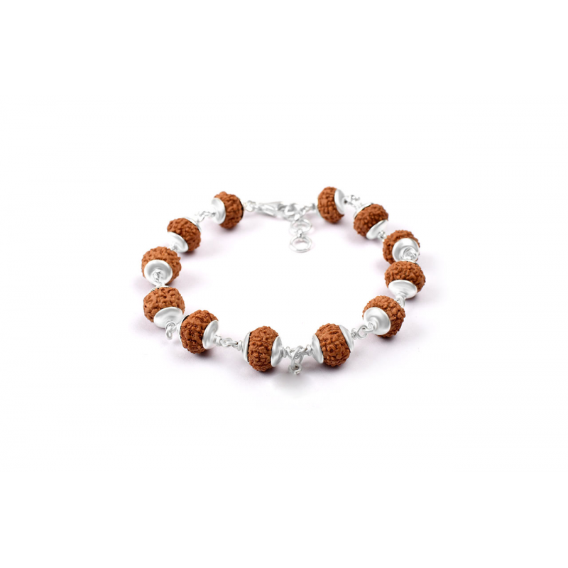 9 Mukhi Durga Shakti Bracelet is made of smooth and uniform nine mukhi Rudraksha from Java with excellent silver topping and silver wire. Made sure about by customizable silver catch, this arm ornament with smooth dabs makes an exquisite every day wear. The nine mukhi Rudraksha speaks to Goddess Durga (Shakti), who is appearance of Kali (security), Saraswati (Knowledge) and Mahalaxmi (Wealth). This Rudraksha favors the wearer with vitality, power, dynamism, courage, information and wealth and helps working of cerebrum and sensory system. It is likewise connected with the planet Rahu and expels its malefic impacts.
